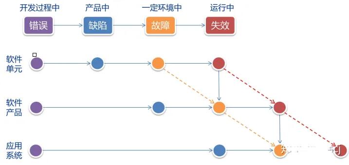 在软件开发过程中的疏忽、失误或者错误,导致软件中存在了缺陷;在软件运行过程中,当缺陷被激活(软件运行于某一特定条件,俗称“踩雷”),使软件产生错误状态即出现了故障;而若无适当的处理措施(容错)对故障加以处理,最终使软件无法向用户提供其所期望的服务,即产生了失效。