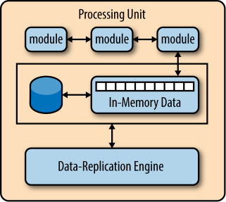 middleware)。如图1所示。处理单元组件包含应用组件(或部分应用组件),它包含Web组件和后端的业务逻辑。处理单元通常包含应用程序模块、内存中的数据网格和一个可选的异步持久化转移模块。还包含一个复制引擎供虚拟中间件调用,来同步各单元之间的数据变化。