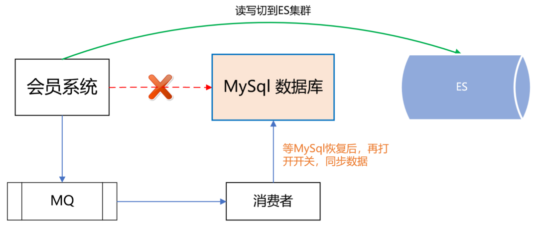 如果dal组件故障或MySql数据库挂了,可以把读写切到ES,等MySql恢复了,再把数据同步到MySql,最后把读写再切回到MySql数据库。如下图所示: