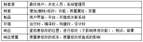 下面我们为每个质量属性提供一张表,该表中给出了质量属性场景每部分的一些可能取值,整体上形成一个一般场景的表格描述。在实际应用时,根据系统的具体情况,从该表中选取适当的值,就能变成具体场景(可读性强
