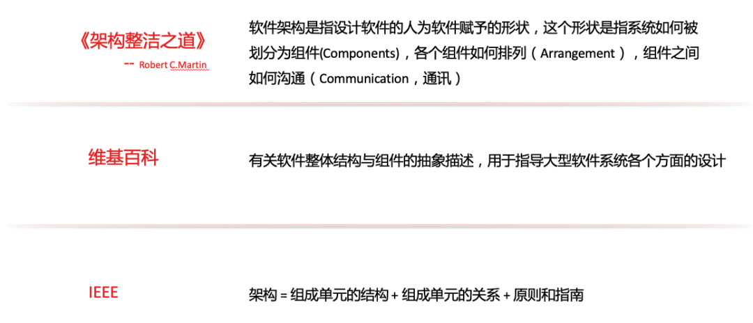 生活中我们经常谈及“架构”,那么到底什么是“架构”,Robert C.Martin《架构整洁之道》中的定义:软件架构是指设计软件的人为软件赋予的形状,这个形状是指系统如何被划分为组件(Components),各个组件如何排列(Arrangement),组件之间如何沟通(Communication,通讯),维基百科的定义:有关软件整体结构与组件的抽象描述,用于指导大型软件系统各个方面的设计,IEEE的定义:架构 = 组成单元的结构 + 组成单元的关系 + 原则和指南,总体来看会包括几个内容: 整体:强调部分的组成,强调合力