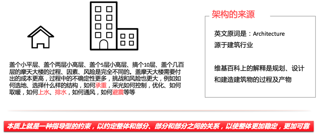 我们知道,架构这个词是源于建筑行业的,英文原词是:Architecture,维基百科上的解释是规划、设计和建造建筑物的过程及产物。那我们就用建筑行业来理解一下。建房子对大家而言再熟悉不过了,那我们盖个小平层、盖个两层小高层、盖个5层小高层、搞个10层、盖个几百层的摩天大楼的过程、因素、风险是完全不同的。