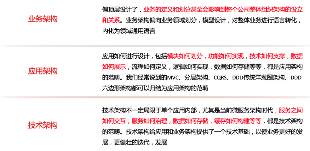 技术架构不一定局限于单个应用内部,尤其是当前微服务架构时代,服务之间如何交互,服务如何治理,数据如何存储,缓存如何构建等等,都是技术架构的范畴。技术架构给应用和业务架构提供了一个技术基础,以使业务更好的发展,更健壮的迭代,发展。