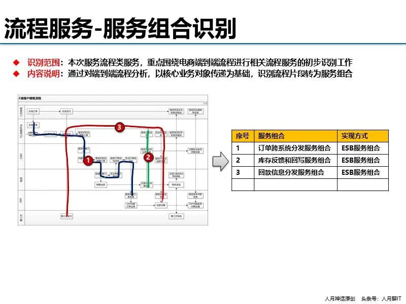 业务和IT融合,关键就是分析端到端流程被拆分到多个业务子系统后是如何支撑业务的,这个时候就需要梳理核心的跨业务系统交互流程,重点只关心跨系统交互和协同。