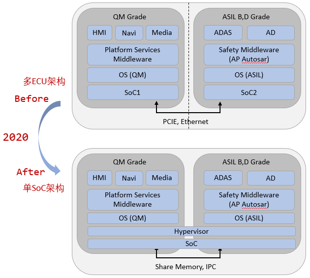 中央计算架构的变化使得多种安全等级的应用运行在同一个系统中,特别是单 SoC 系统后,"混合关键性"额外的重要。