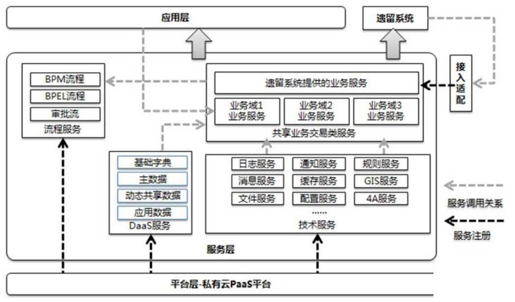 其中PaaS技术平台层提供的4A和流程服务、DaaS数据库服务、技术服务(消息、日志、安全、文件、配置、通知、GIS)等服
