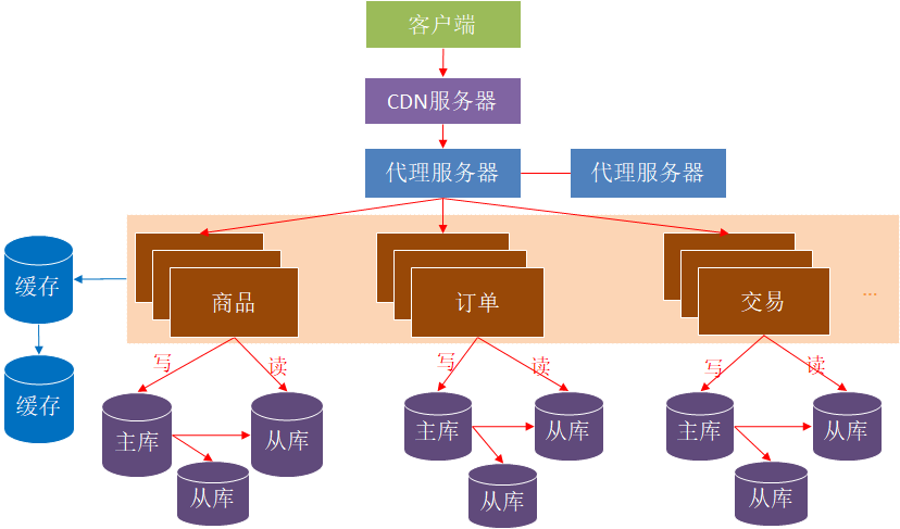 拆分成商品、订单、交易、用户、支付等多个系统,每个系统都都是多台服务器构成的集群。