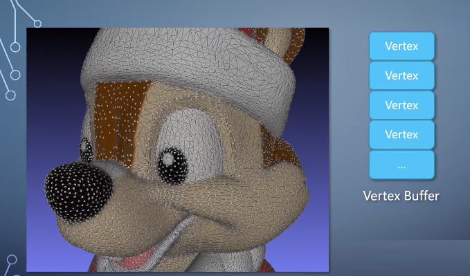 里面的每一个单元是一个整数,表示vertex的索引。这样的buffer称为index buffer。有了这两个,就可以表示出一个几何形状。