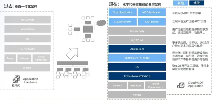 今天的电子电气架构相对于以往发生了重要变化,首先相对于以往分布式架构中众多计算资源有限的ECU而言,新的架构引入了高性能计算单元HPC,同时车辆不再是封闭的系统,而是整个IoT(物联网)的一部分,另外在车辆软件层面,在传统Classic