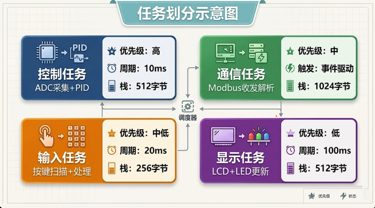 按功能拆,6个任务。但如果你仔细看,ADC采集和PID运算周期一样、时序上强关联,完全可以合并成一个任务。LED指示和屏幕刷新都是低优先级的显示类操作,也可以合并。