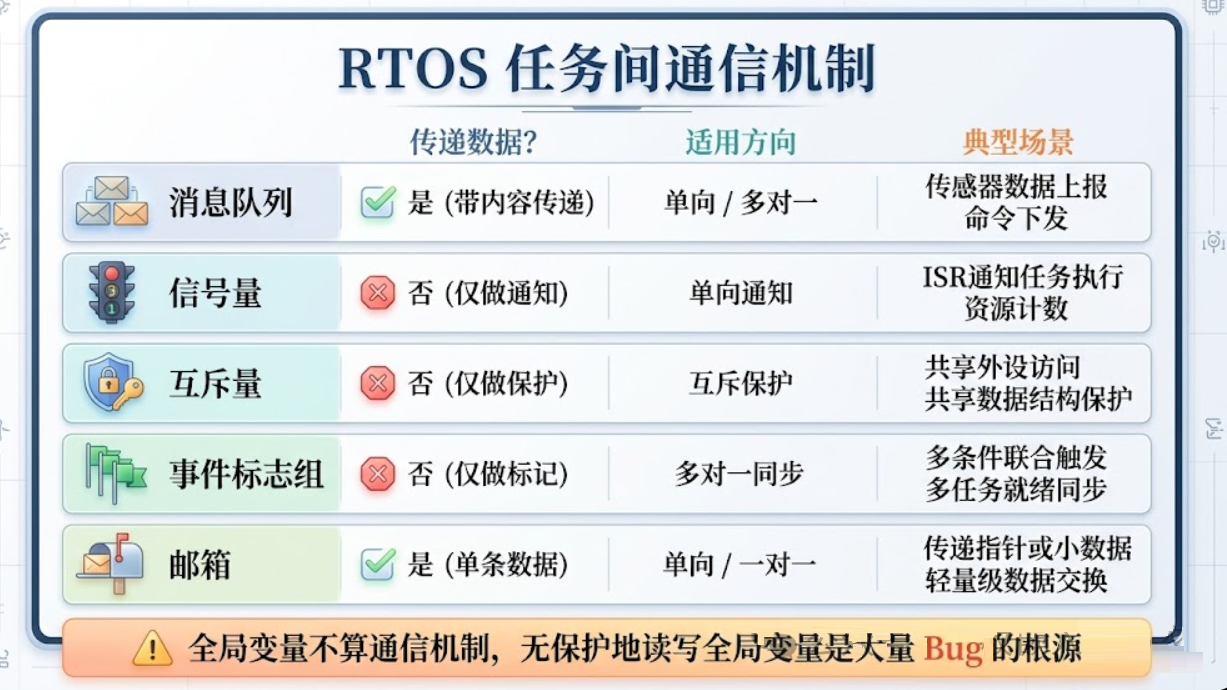 RTOS提供的通信机制不少,但很多人搞不清楚什么场景该用什么。先看一张全景图: