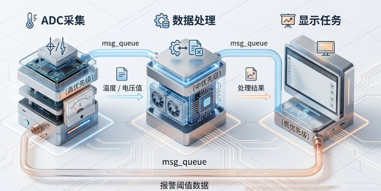 队列的好处很直接: 生产者和消费者完全解耦,速度不一致也没关系 。ADC任务10ms采一次,显示任务100ms刷新一次,中间有队列做缓冲,各跑各的节奏。
