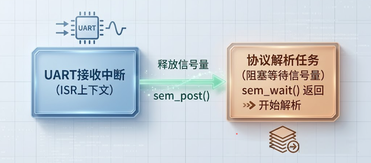 信号量不传数据,只做通知和同步。最经典的场景: 中断服务程序(ISR)通知任务去干活。