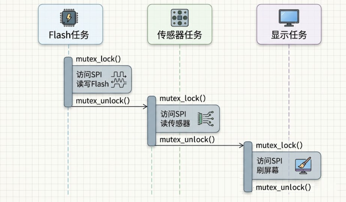 最典型的场景:多个任务都要用SPI总线读写不同的外设。