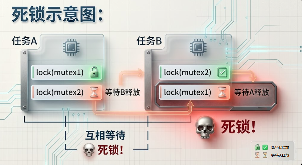 2. 警惕死锁。 任务A先锁mutex1再锁mutex2,任务B先锁mutex2再锁mutex1——经典死锁。项目规范里必须约定 加锁顺序 ,所有任务按同样的顺序获取多把锁。