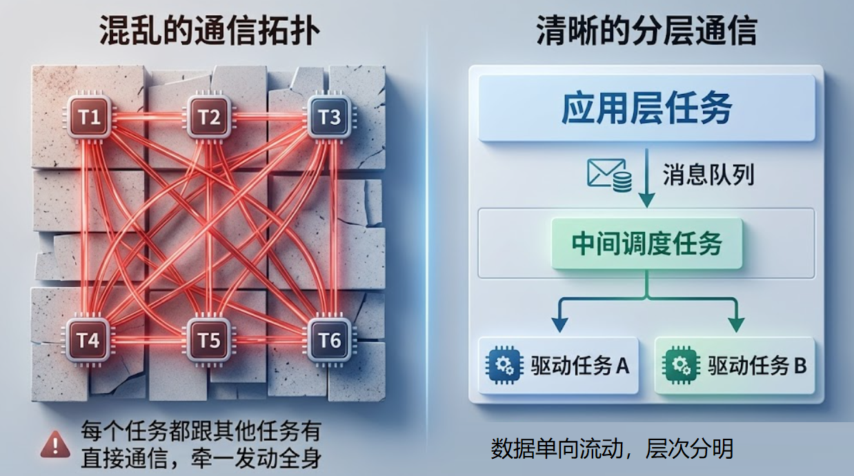 5. 别把通信做成蜘蛛网。 如果你画出任务间的通信 拓扑图 ,发现是一团乱麻——每个任务跟好几个任务有直接的队列或共享变量——那说明你的架构需要重新审视了。好的设计应该像下面这样,有清晰的层次和流向: